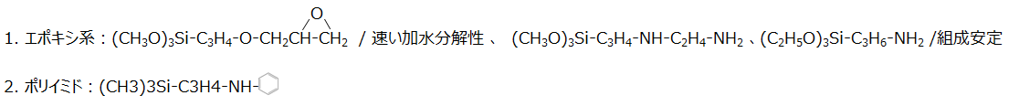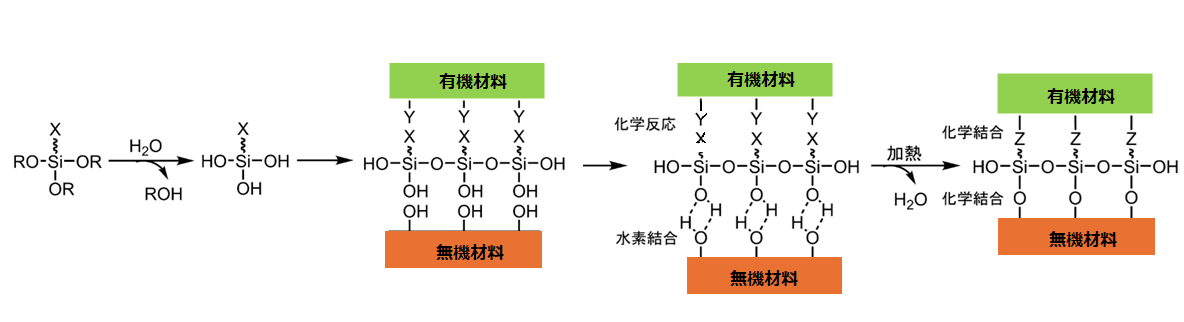 〇シランカップリング剤の分子中、有機材料と化学反応する官能基はビニル基、エポキシ基、アミノ基、メタクリル基などがあり、また、無機材料と化学反応する官能基は、メトキシ基やエトキシ基となる。 シランカップリング剤は水素結合または共有結合で有機、無機物質と結合し、水素結合では静電的な力でゆるやかに結合し、共有結合では「加水分解反応」や「縮合反応」を伴い強固に結合します。