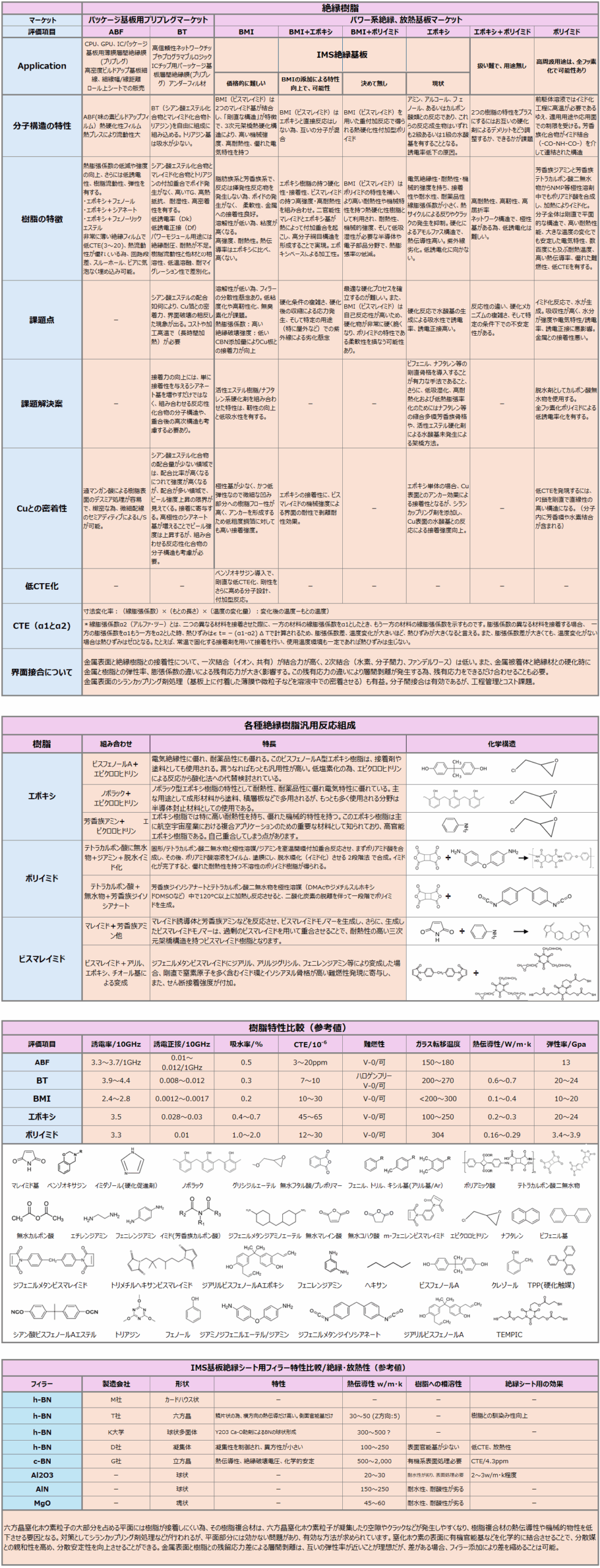 以下にIMS基板で使用される絶縁樹脂、反応組成樹脂特性の比較をまとめました。またご参考までにプリプレグ用絶縁樹脂も載せております。